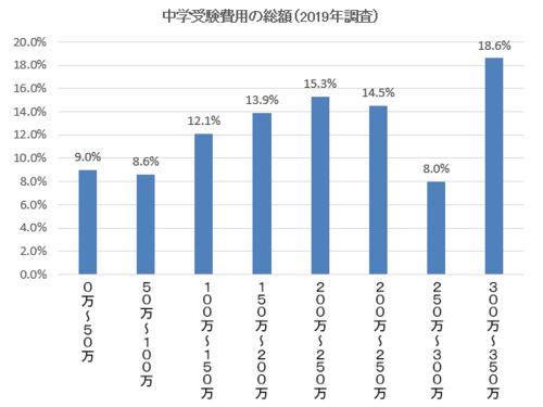 このグラフはのエデュママアンケート『中学受験、費用は全部でいくら? 終了組に聞きました。』(https://www.inter-edu.com/article/enquete/enquete-190322/) の結果です。 受験にかかる費用として塾、通信教育費、個別塾などのトータルでかかる費用を考え…