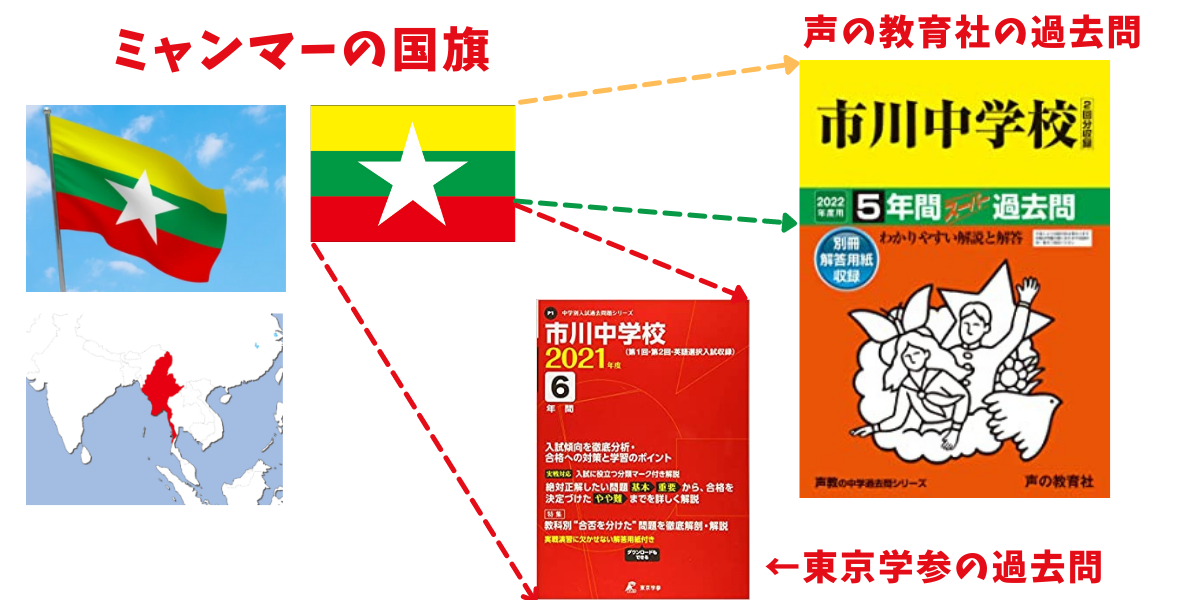 中学受験マニアはミャンマーの国旗を見ると、【声の教育社の過去問】と【東京学参の過去問】の配色だなぁとおもってしまいがち、かも。